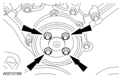 73. Position the coolant pump pulley on the coolant pump and install the 4 bolts.