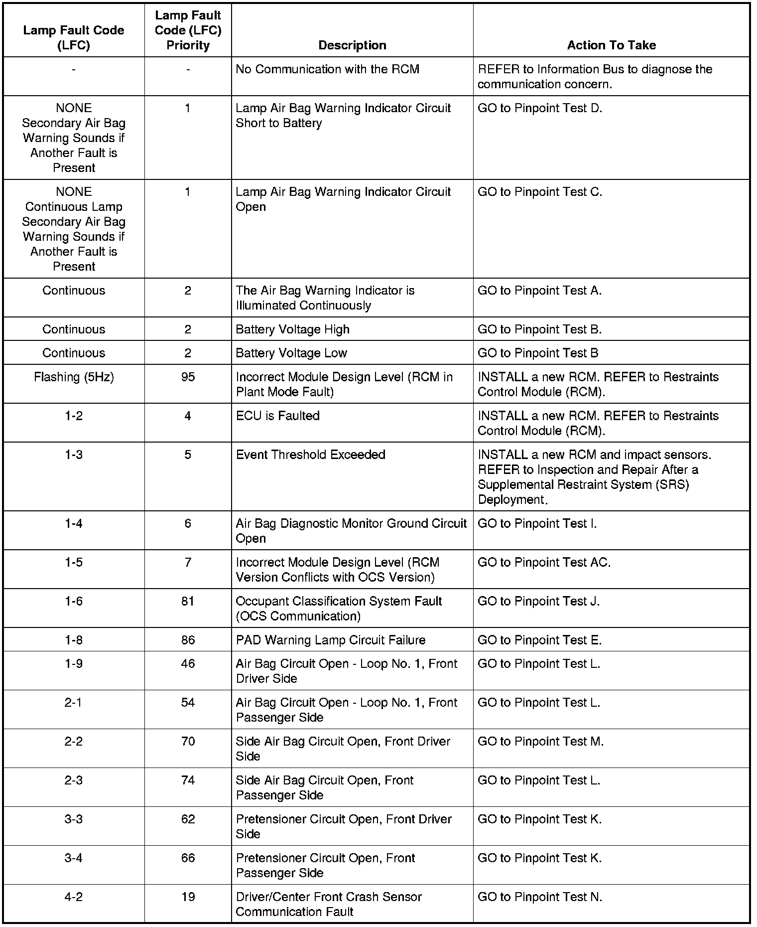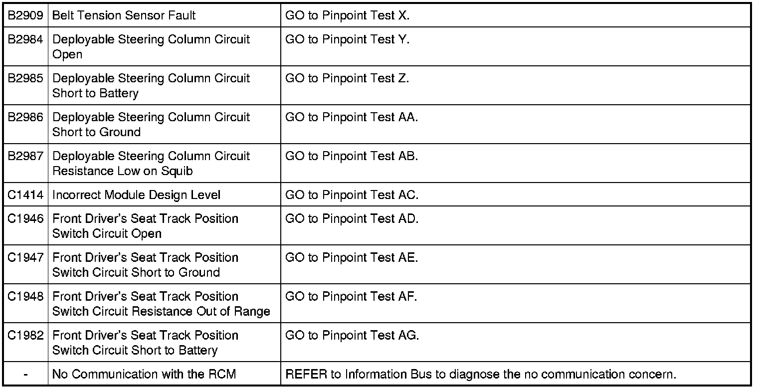 Restraints Control Module (RCM) DTC Charts