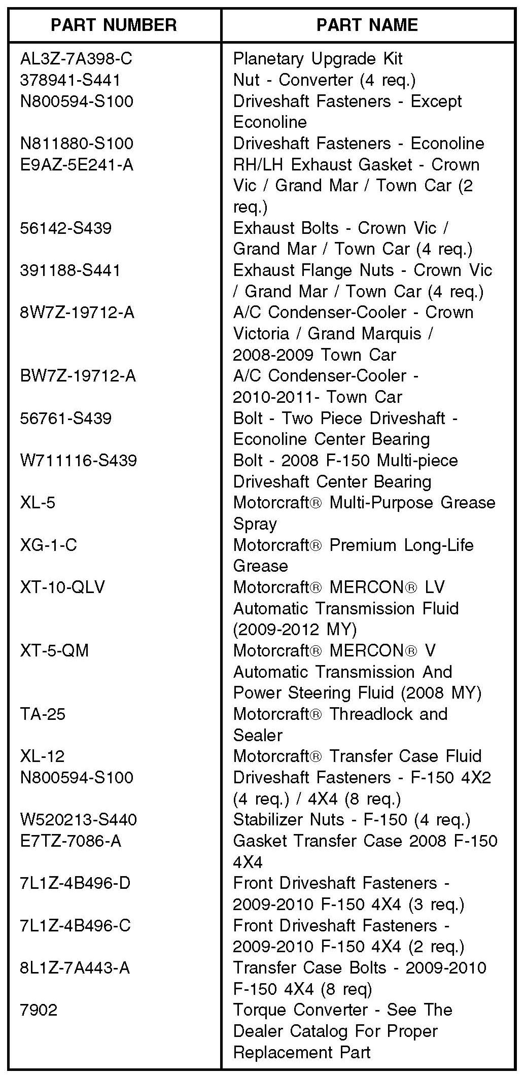 A service kit has been released to assist with proper repair of the 4R75E transmission in 2008 Mark LT, 2008-2010 F-150, E-Series, 2008-2011 Crown Victoria, Grand Marquis and Town Car vehicles that exhibit a grinding, whine-type noise, vibration and/or gear slippage while driving or a loss of reverse resulting from a planetary gear assembly failure.
