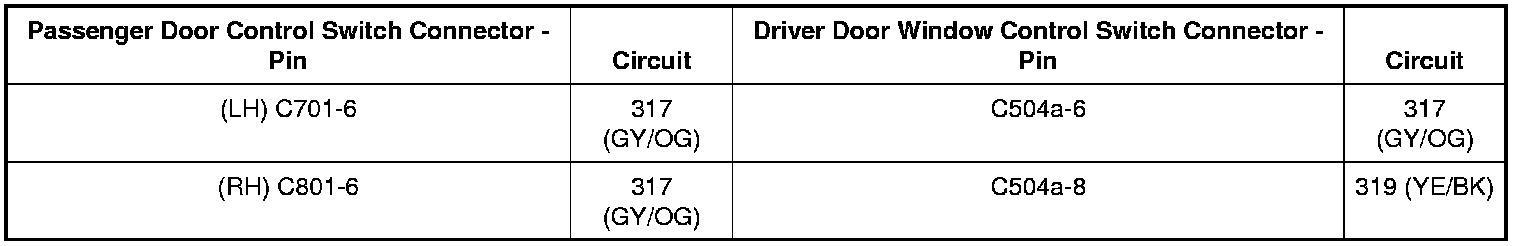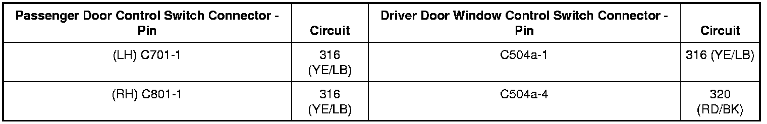 When the left rear power window is operated in the down direction from the driver window control switch, voltage is sent to left rear window control switch through circuit 316 (YE/LB), which transfers voltage to the left rear window motor through circuit 333 (YE/RD). Ground is provided to the left rear window control switch through circuit 317 (GY/OG), which transfers ground to the left rear window motor through circuit 334 (RD/YE). When the left rear window is operated in the up direction from the driver window control switch, voltage is sent to the left rear window control switch through circuit 317 (GY/OG), which transfers voltage to the left rear window motor through circuit 334 (RD/YE). Ground is provided to the left rear window control switch through circuit 316 (YE/LB), which transfers ground to the left rear window motor through circuit 333 (YE/RD).