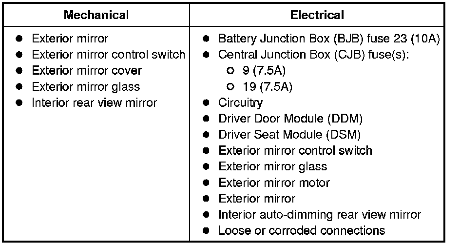 10. If no DTCs related to the concern are retrieved, GO to Symptom Chart - Exterior Rear View Mirrors or GO to Symptom Chart - NVH. Symptom Chart - Exterior Rear View Mirrors Symptom Chart - NVH