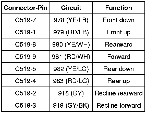 - Measure the voltage between driver seat control switch C519, harness side and ground, using the following chart: