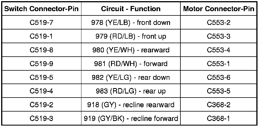 - Measure the resistance between driver seat control switch C519, harness side and power seat motor C353 or recliner motor C368, harness side using the following chart: