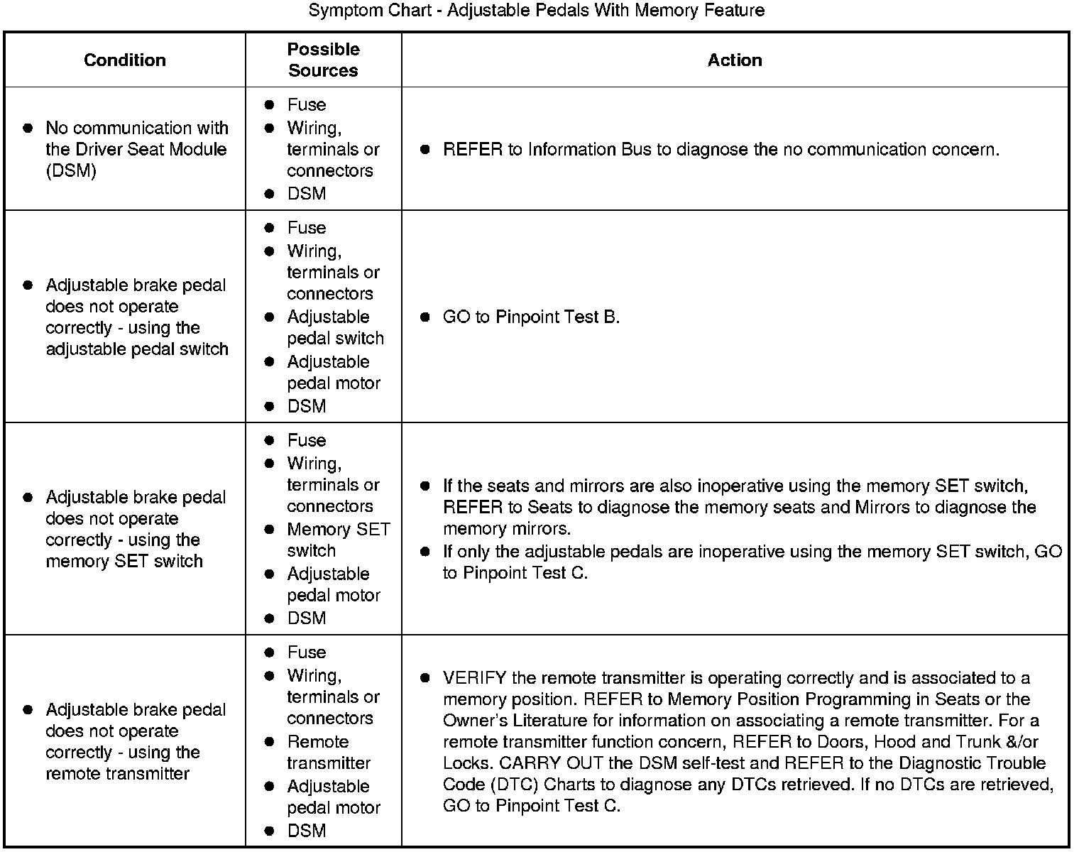 Symptom Chart - Adjustable Pedals With Memory Feature