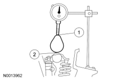 3. Install the Dial Indicator Gauge with Holding Fixture so the rounded tip of the dial indicator is on top of the camshaft lobe and on the same plane as the hydraulic lash adjuster.