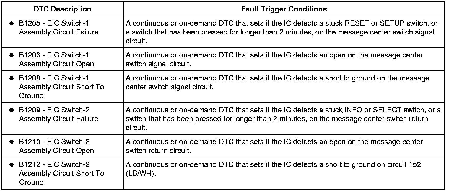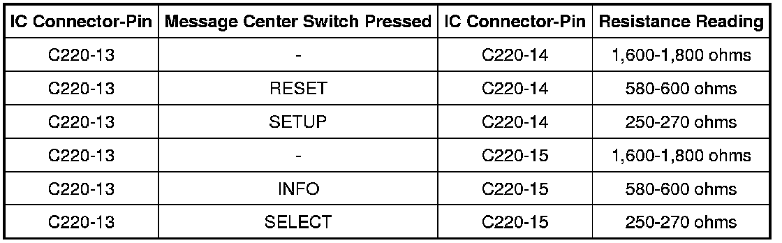The message center functionality is controlled through the message center switches which are hardwired to the Instrument Cluster (IC) through the message center signal and return circuits. Each message center switch uses a different resistance value allowing the IC to determine which switch is pressed.
