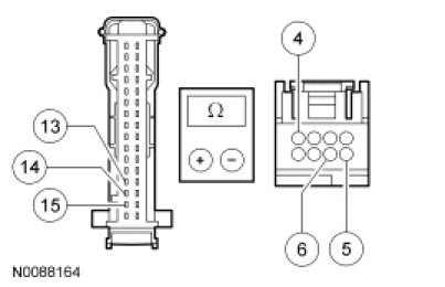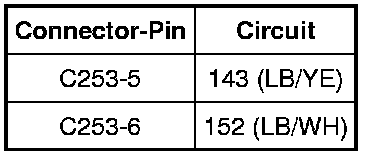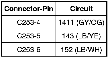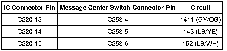 - Measure the resistance between the message center switch C253-5, circuit 143 (LB/YE), harness side and the message center switch C253-4, circuit 1411 (GY/OG), harness side; and between the message center switch C253-6, circuit 152 (LB/WH), harness side and the message center switch C253-4, circuit 1411 (GY/OG), harness side.