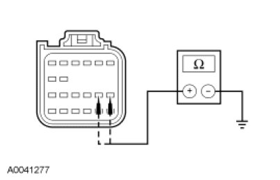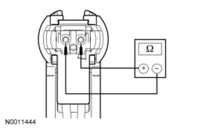 - Measure the resistance between clockspring C218a-7, circuit 1516 (YE/WH), harness side and C218a-8, circuit 1517 (RD/OG), harness side.