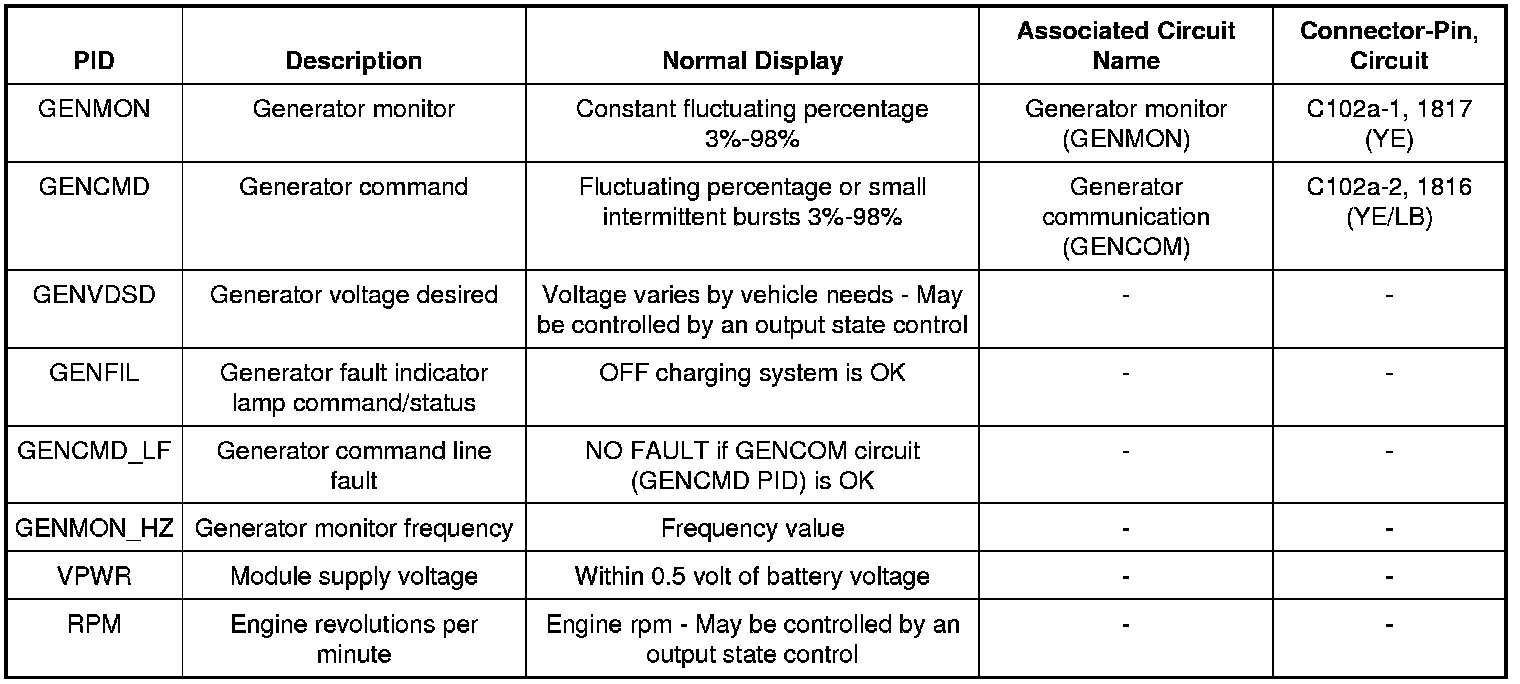 The PIDs and their associated descriptions used in charging system diagnosis are listed below: