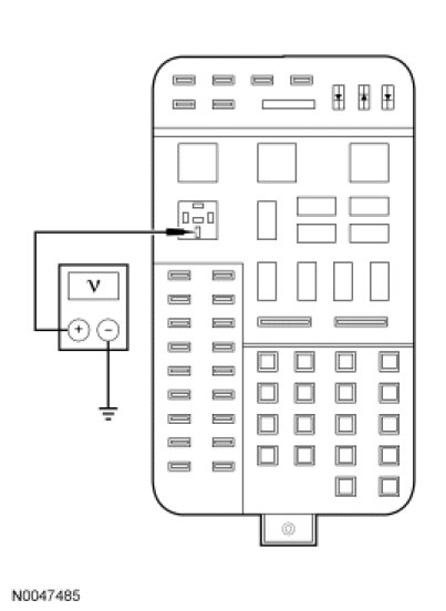 - Measure the voltage at the BJB starter relay pin 30, circuit 32 (RD/LB) and ground.