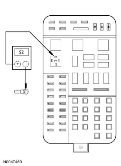 - Measure the resistance between BJB starter relay pin 87, circuit 113 (YE/LB) and ground.