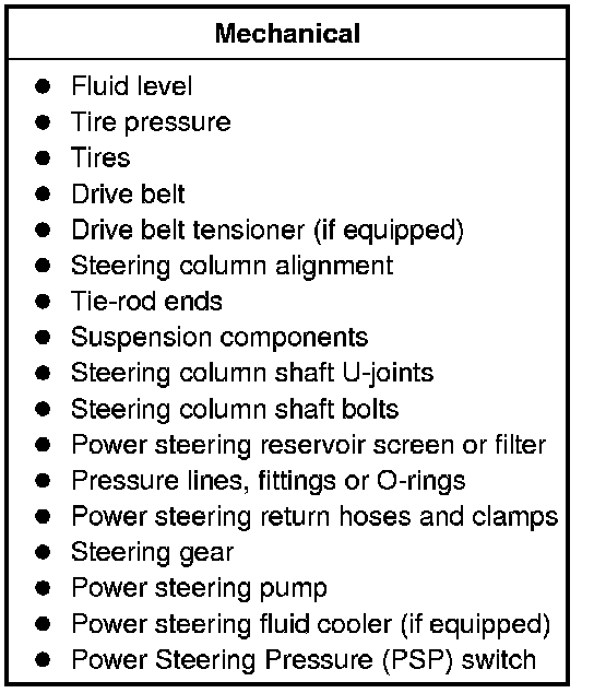 9. If the cause is not visually evident, verify the symptom and GO to Symptom Chart - Steering System or GO to Symptom Chart - NVH. Symptom Chart - Steering System Symptom Chart - NVH