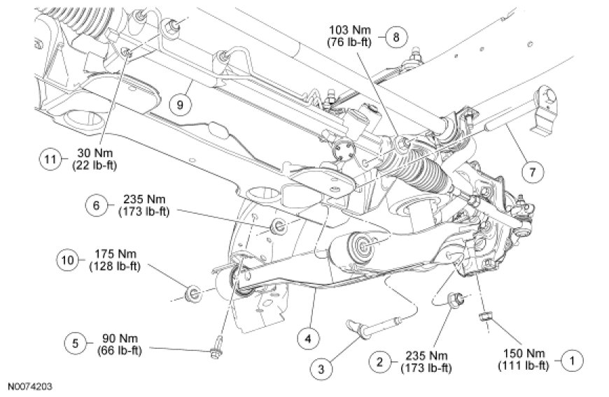 11. If a new lower control arm is being installed, tighten the new bushing nut to 175 Nm (128 lb-ft).