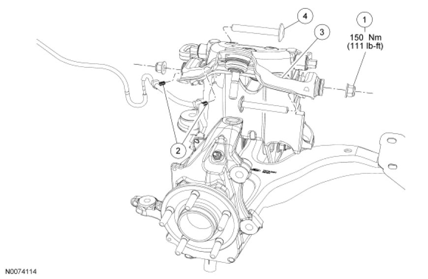 5. With the weight of the vehicle on the wheel and tire assemblies, tighten the 2 new upper arm nuts to 150 Nm (111 lb-ft).