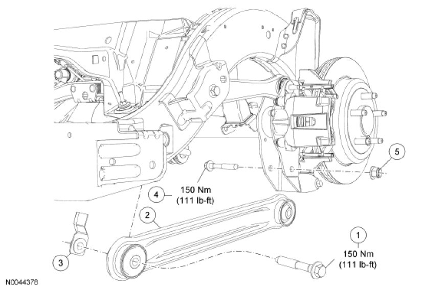 NOTICE: Suspension fasteners are critical parts because they affect performance of vital components and systems and their failure may result in major service expense. New fasteners must be installed with the same part number or an equivalent part if installation is necessary. Do not use a replacement part of lesser quality or substitute design. Torque values must be used as specified during reassembly to make sure of correct retention of these parts. Orientation of the fasteners is also important on all rear suspension arms. Make sure the fasteners are installed in the same direction as they were in when removed.