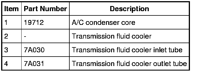 The transmission fluid cooler contains a thermostatic bypass valve and is part of the A/C condenser core, with the bottom rows of the A/C condenser being used as the transmission fluid cooler. The transmission fluid cooler cannot be serviced separately.