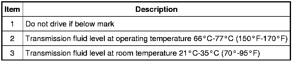 NOTE: The transmission fluid level reading on the transmission fluid level indicator will differ from operating and ambient temperatures. The correct reading should be within the normal operating temperature range.