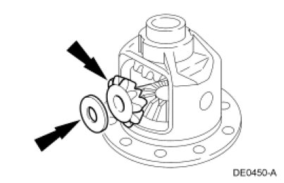 5. Install the differential pinion gears and differential pinion gear thrust washers opposite the differential side gears.