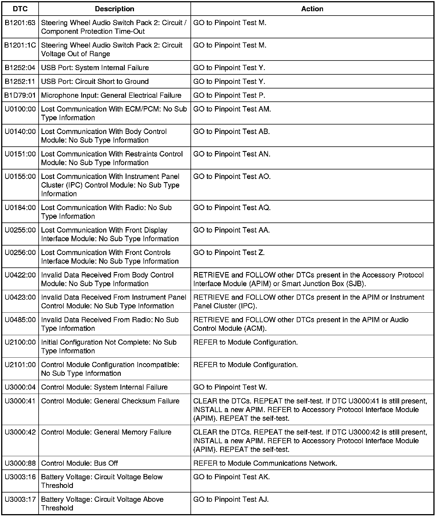 Accessory Protocol Interface Module (APIM) DTC Chart