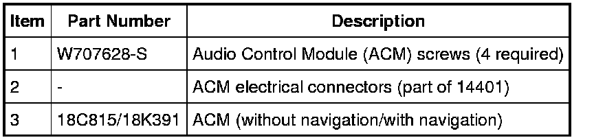 NOTE: The Audio Control Module (ACM) and the Front Controls Interface Module (FCIM) are serviced separately. For additional information on the removal of the FCIM, refer to Front Controls Interface Module (FCIM) - Without Navigation Front Controls Interface Module (FCIM) - Without Navigation or Front Controls Interface Module (FCIM) - With Navigation Front Controls Interface Module (FCIM) - With Navigation.