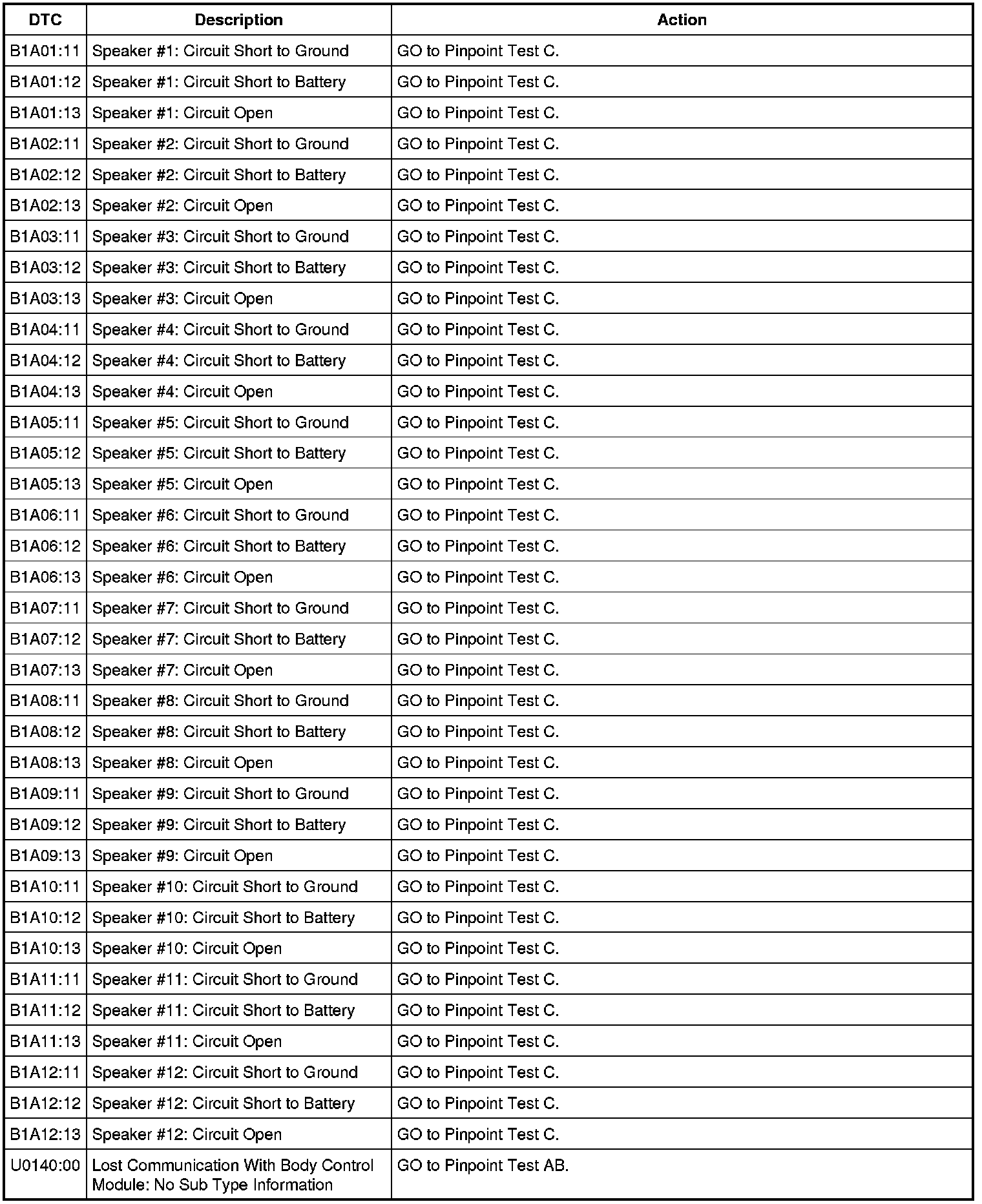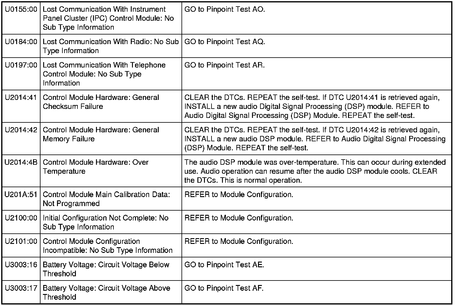 NOTE: This module utilizes a 5-character DTC followed by a 2-character failure-type code. The failure-type code provides information about specific fault conditions such as opens, or shorts to ground. Continuous memory DTCs have an additional 2-character DTC status code suffix to assist in determining DTC history.