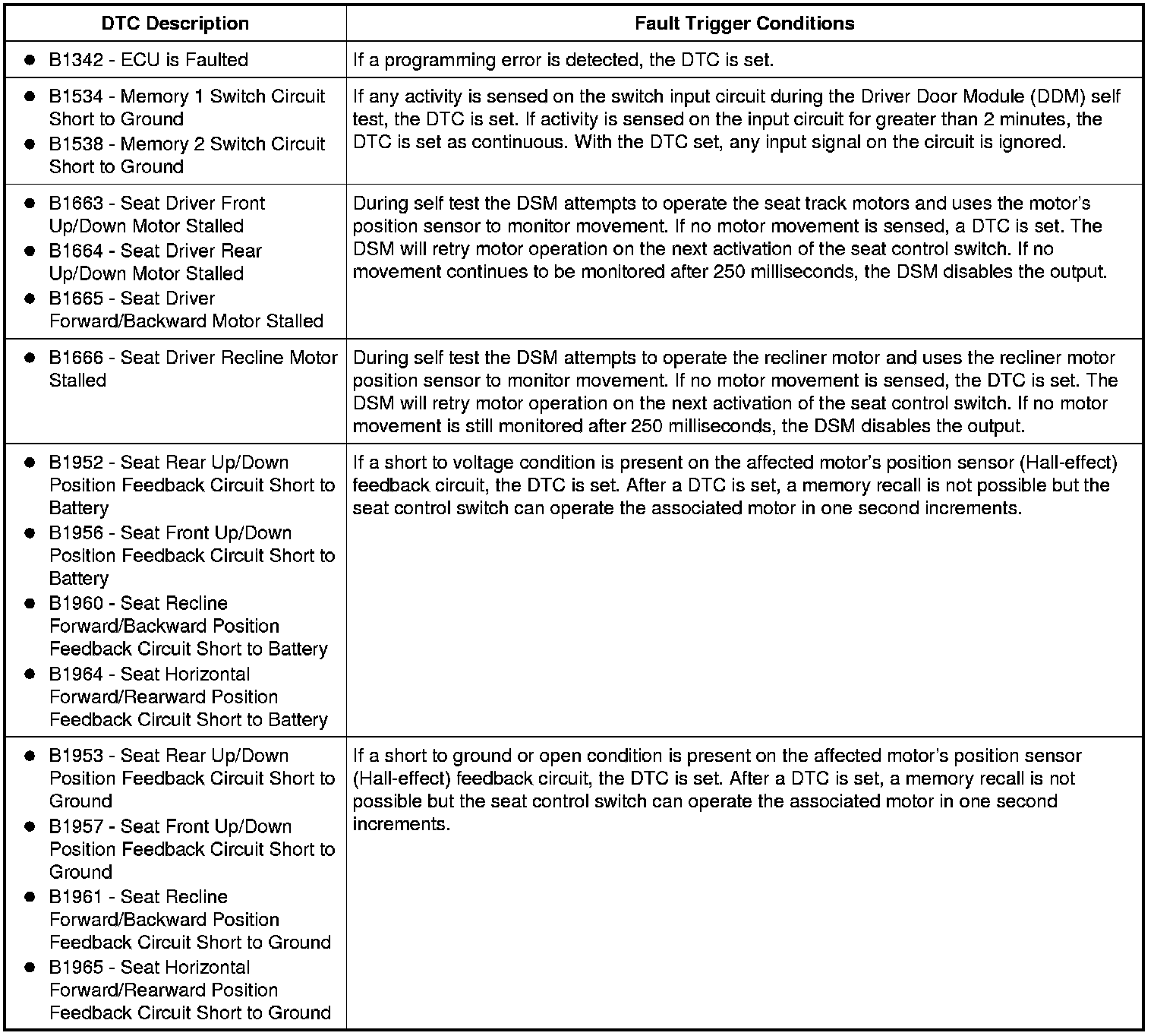 For any other DSM DTCs, REFER to the Driver Seat Module (DSM) DTC Chart. Driver Seat Module (DSM) DTC Chart