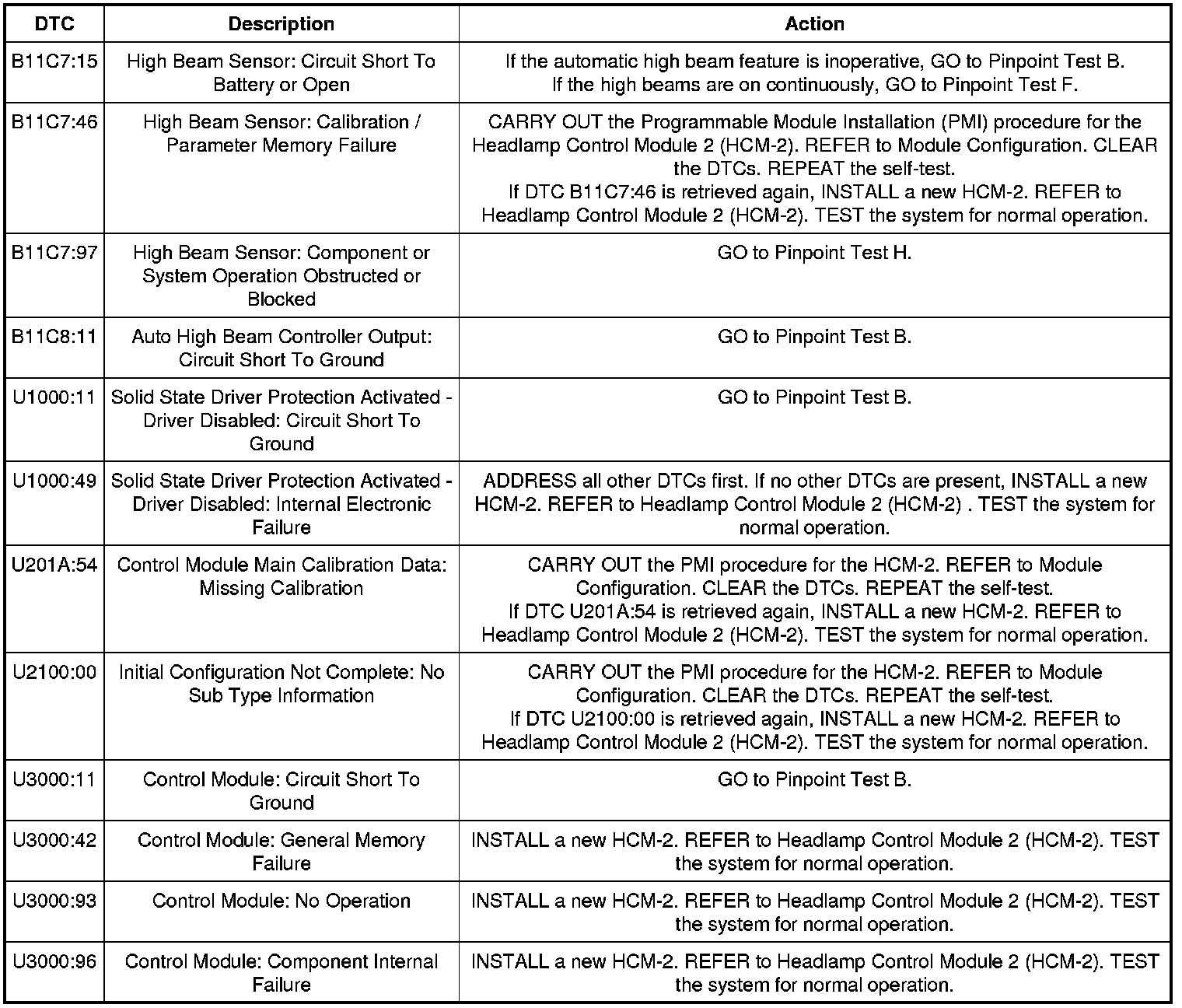 Headlamp Control Module 2 (HCM-2) DTC Chart