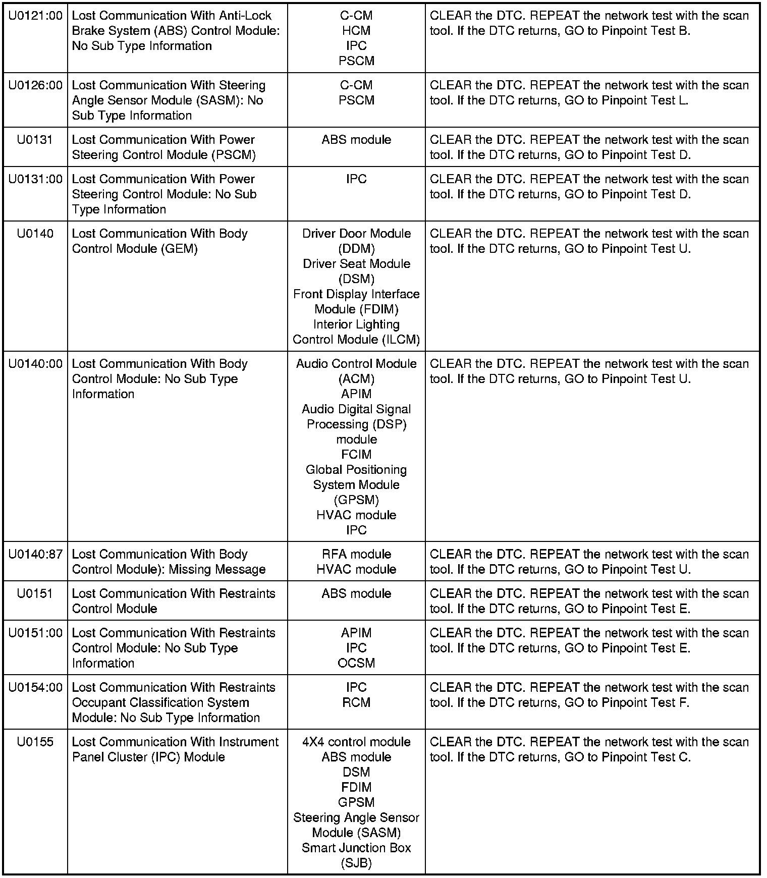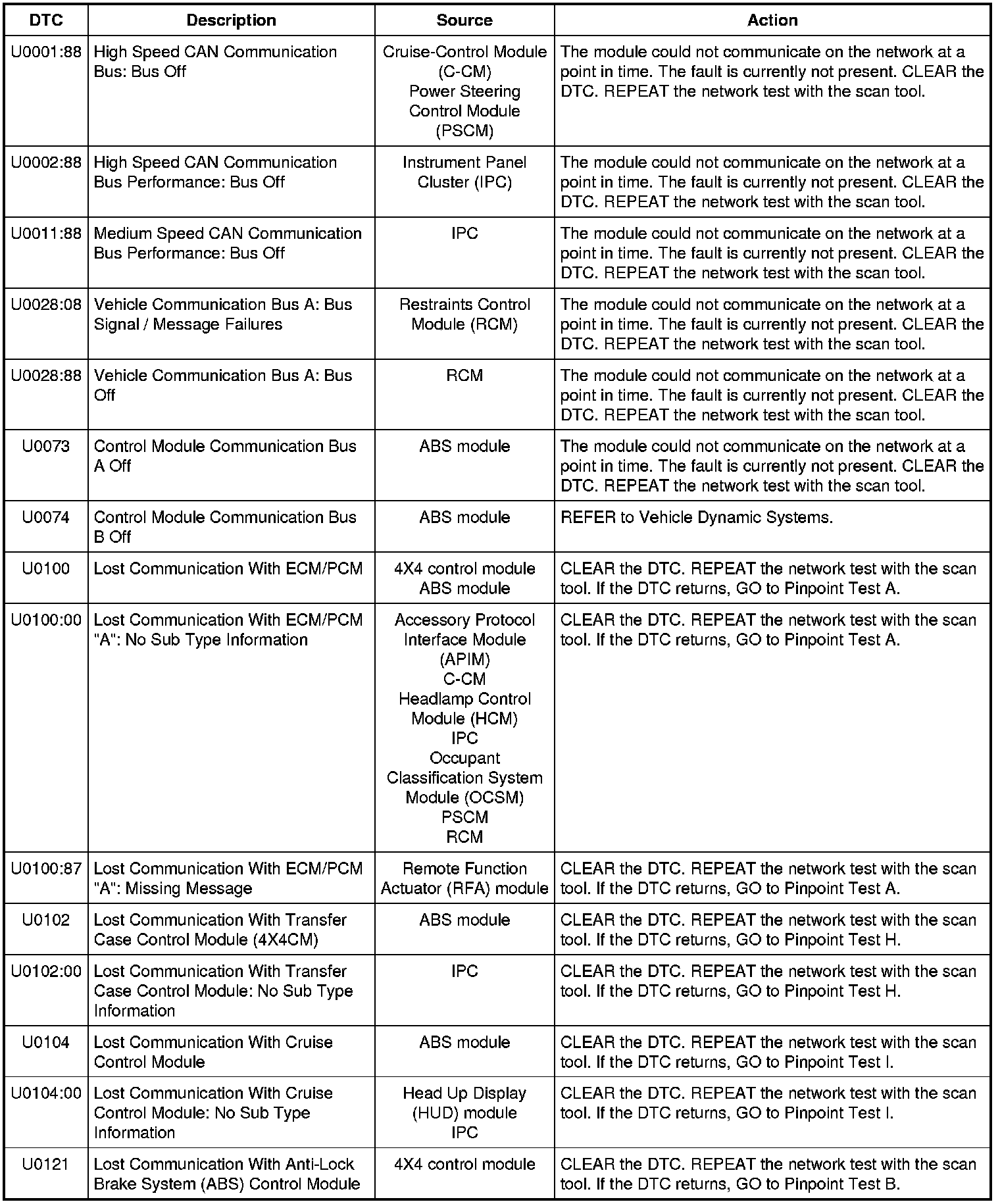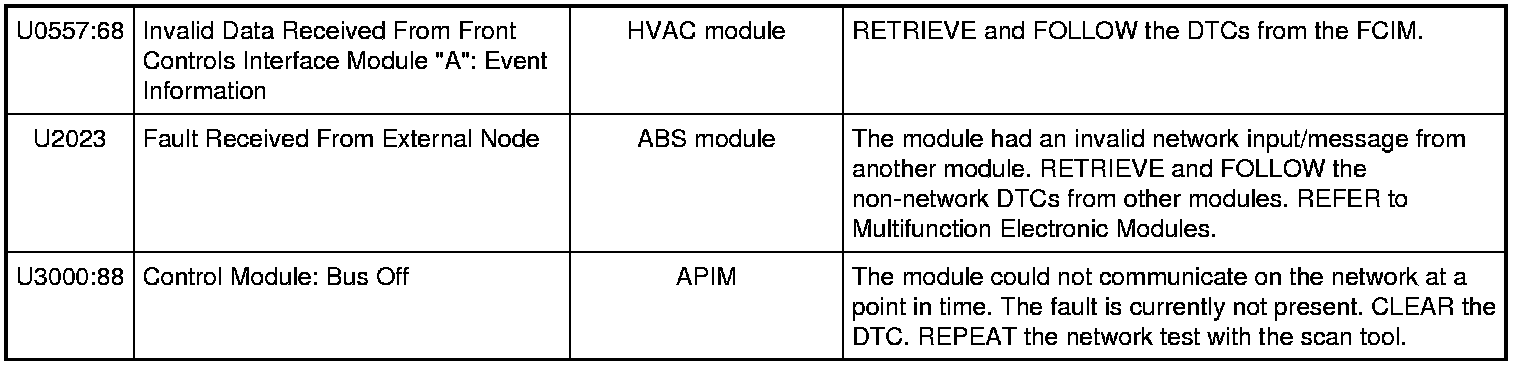 NOTE: Network DTCs (U-codes) are often a result of intermittent concerns such as faulty wiring or low battery voltage occurrences. Additionally, vehicle service procedures such as module reprogramming often sets network DTCs. Replacing a module to resolve a network DTC is unlikely to resolve the concern. To prevent repeat network DTC concerns, inspect all network wiring, especially connectors. Test the vehicle battery, refer to Battery, Mounting and Cables Testing and Inspection.
