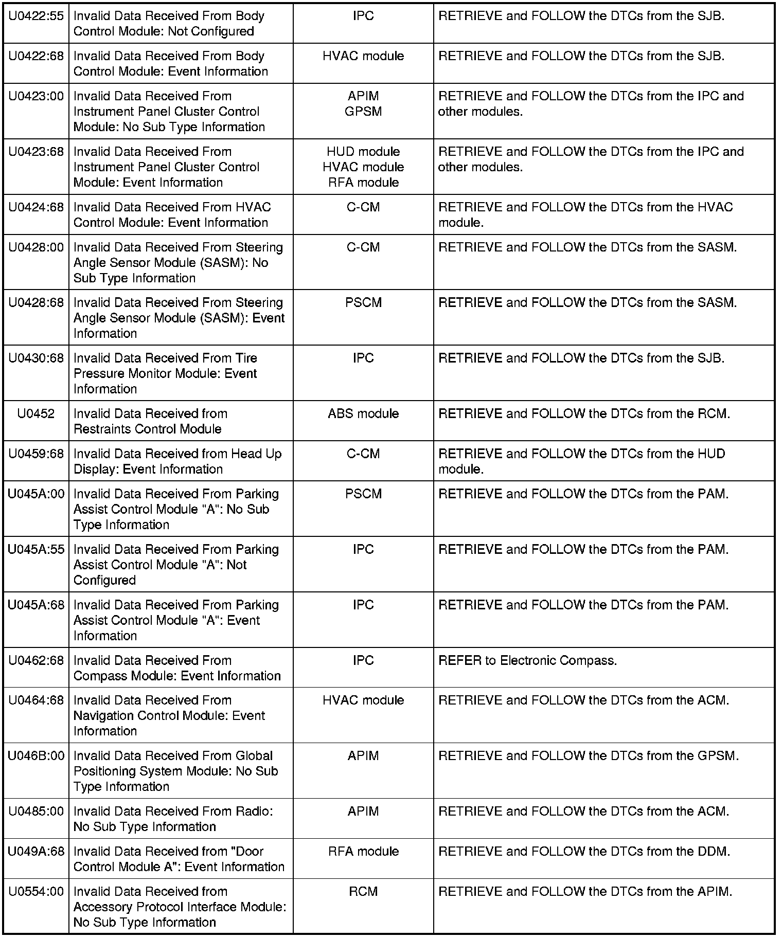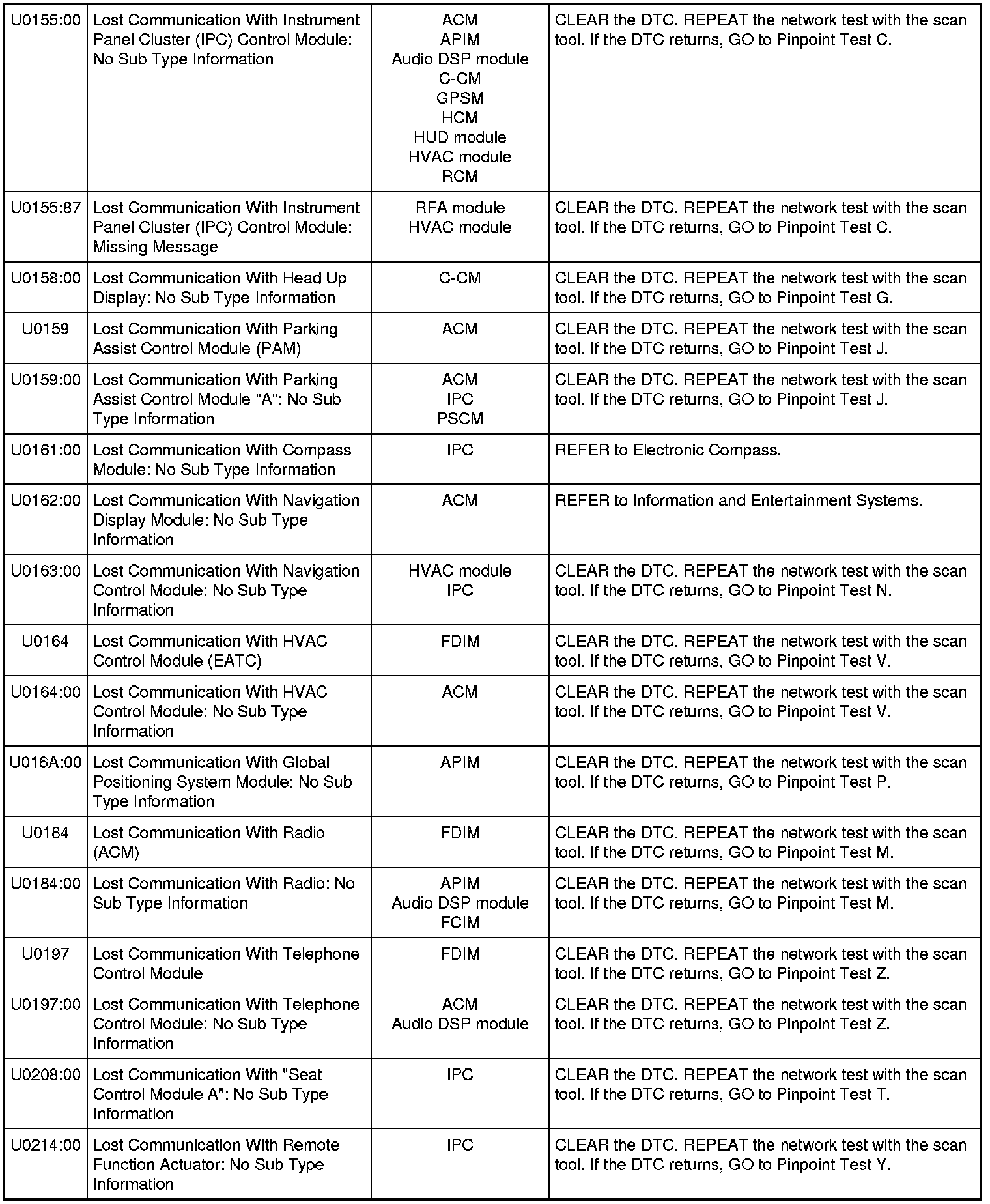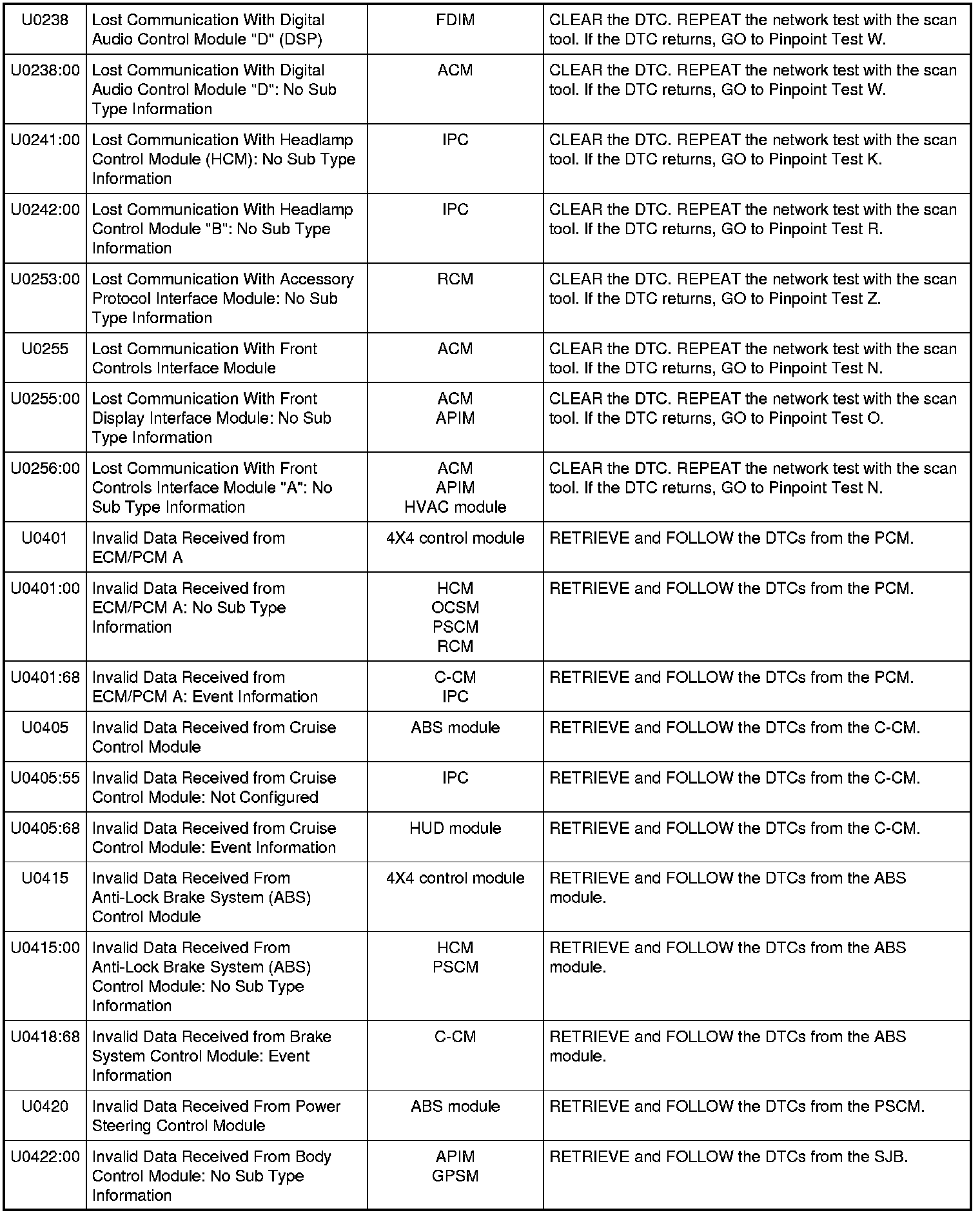 NOTE: Network DTCs (U-codes) are often a result of intermittent concerns such as faulty wiring or low battery voltage occurrences. Additionally, vehicle service procedures such as module reprogramming often sets network DTCs. Replacing a module to resolve a network DTC is unlikely to resolve the concern. To prevent repeat network DTC concerns, inspect all network wiring, especially connectors. Test the vehicle battery, refer to Battery, Mounting and Cables Testing and Inspection.