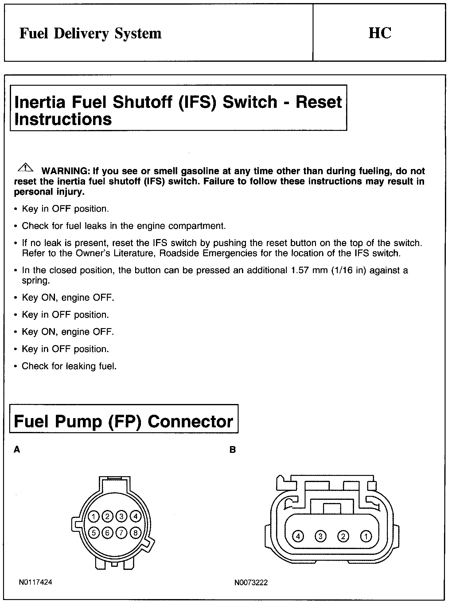 Inertia Fuel Shutoff (IFS) Switch - Reset Instructions And Fuel Pump (FP) Connector: