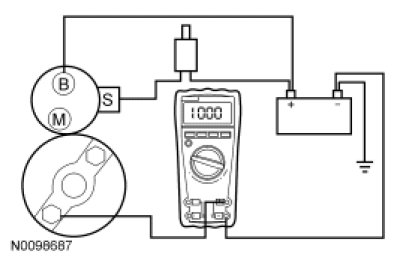 7. Remove the cables from solenoid B-, S- and M-terminals. Clean the cables and connections and reinstall the cables to the correct terminals. Repeat Steps 3 through 6. If the voltage drop reading is still greater than 0.8 volt when checked at the M-terminal and less than 0.8 volt when checked at the B-terminal, the concern is in the solenoid contacts. Install a new starter motor. Refer to Starter Motor Service and Repair.
