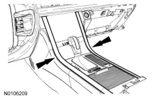 - Using a suitable tool, push the brake shift interlock override mechanism on the selector lever forward.