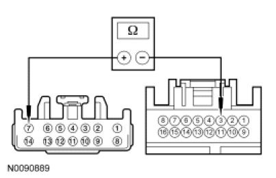 - Measure the resistance between LH front window control switch C504-3, circuit CBB38 (GY/BU), harness side and SJB C2280A-7, circuit CBP41 (BU), harness side.