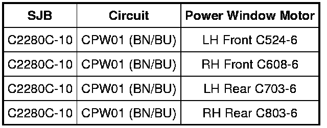 - Measure the resistance between SJB C2280C-10, circuit CPW01 (BN/BU), harness side and LH front window motor C524-6, circuit CPW01 (BN/BU), harness side.