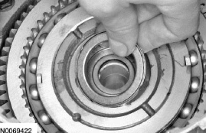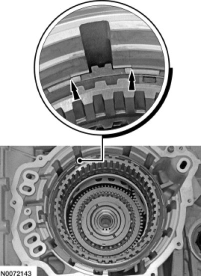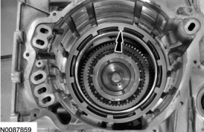 73. Compare the position of the low OWC snap ring gap with the tab on the low/reverse clutch pressure plate to be sure that the gap is in the right position.