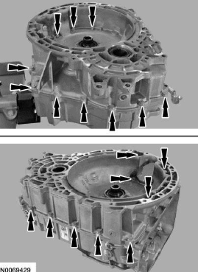 56. NOTICE: Make sure the sealing surface of both the transaxle case and the torque converter housing are clean, dry and free of oil or the silicone will not seal the transaxle case.
