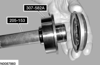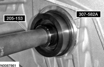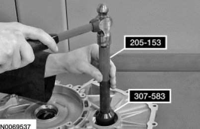 60. Using the Handle 205-153 and the Cover Axle Seal Installer 307-582A, install the halfshaft seal in the transaxle case.