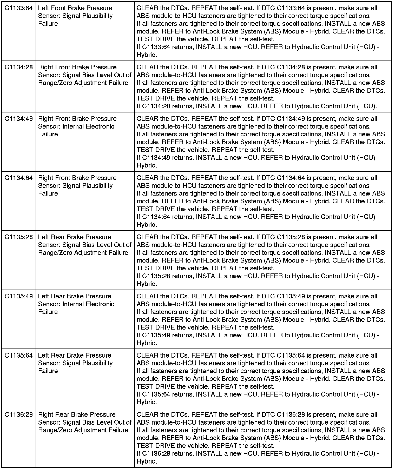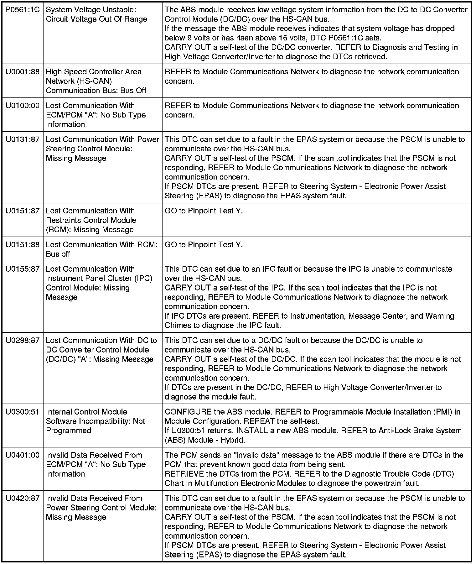 NOTE: This DTC chart applies to hybrid vehicles only. For non-hybrid vehicle DTCs, refer to the ABS Module DTC Chart in Anti-Lock Control - Non-Hybrid.