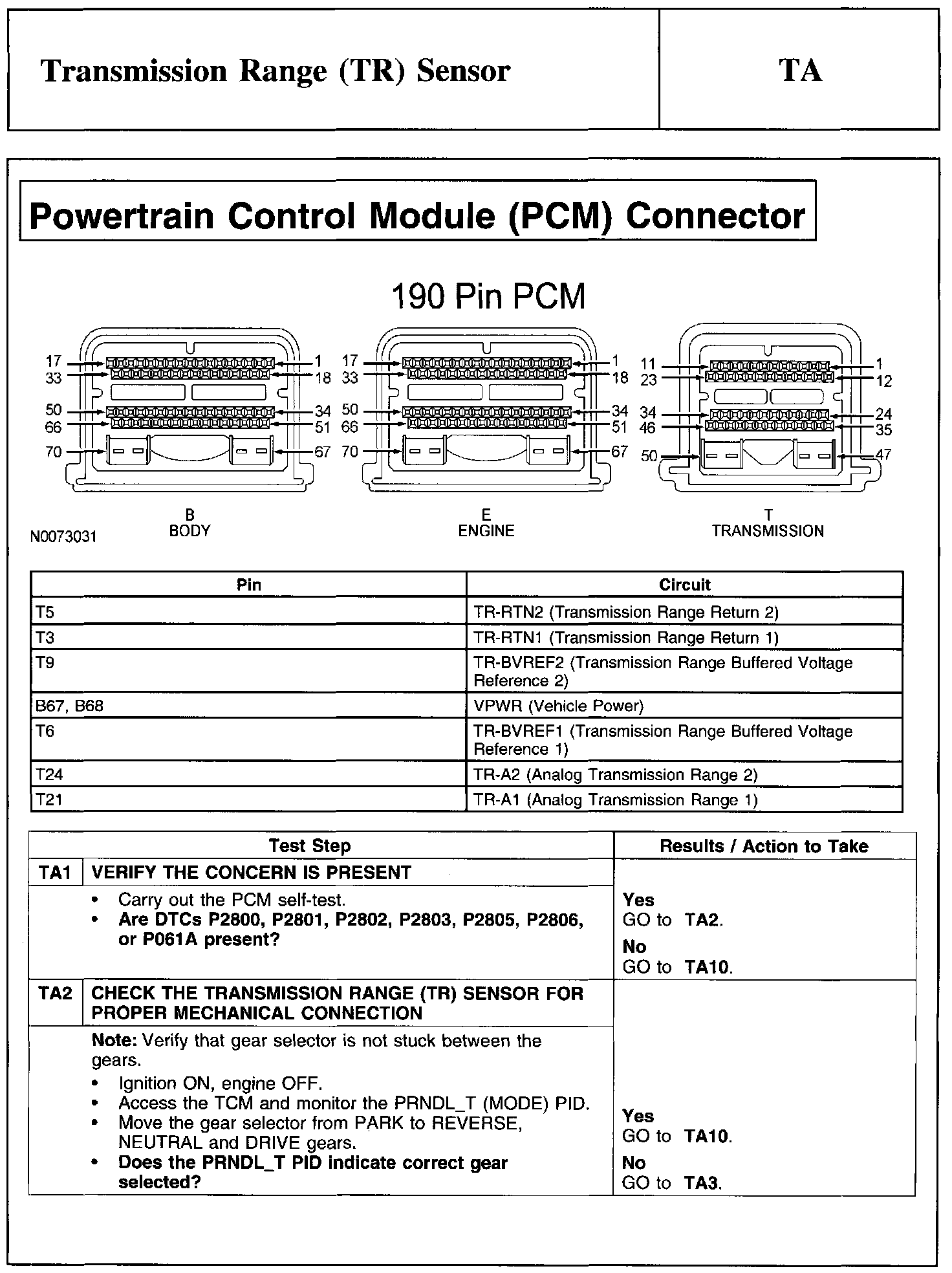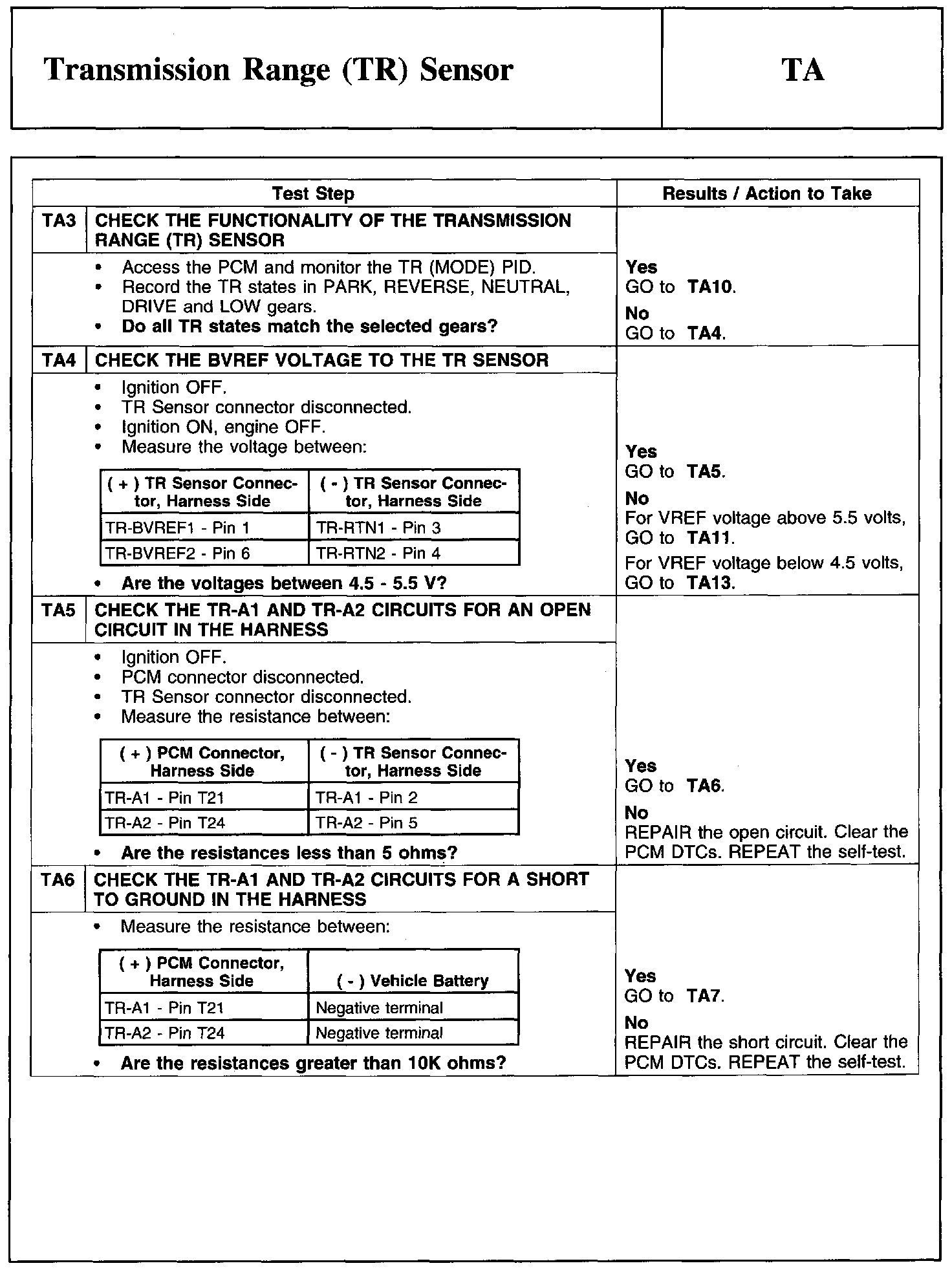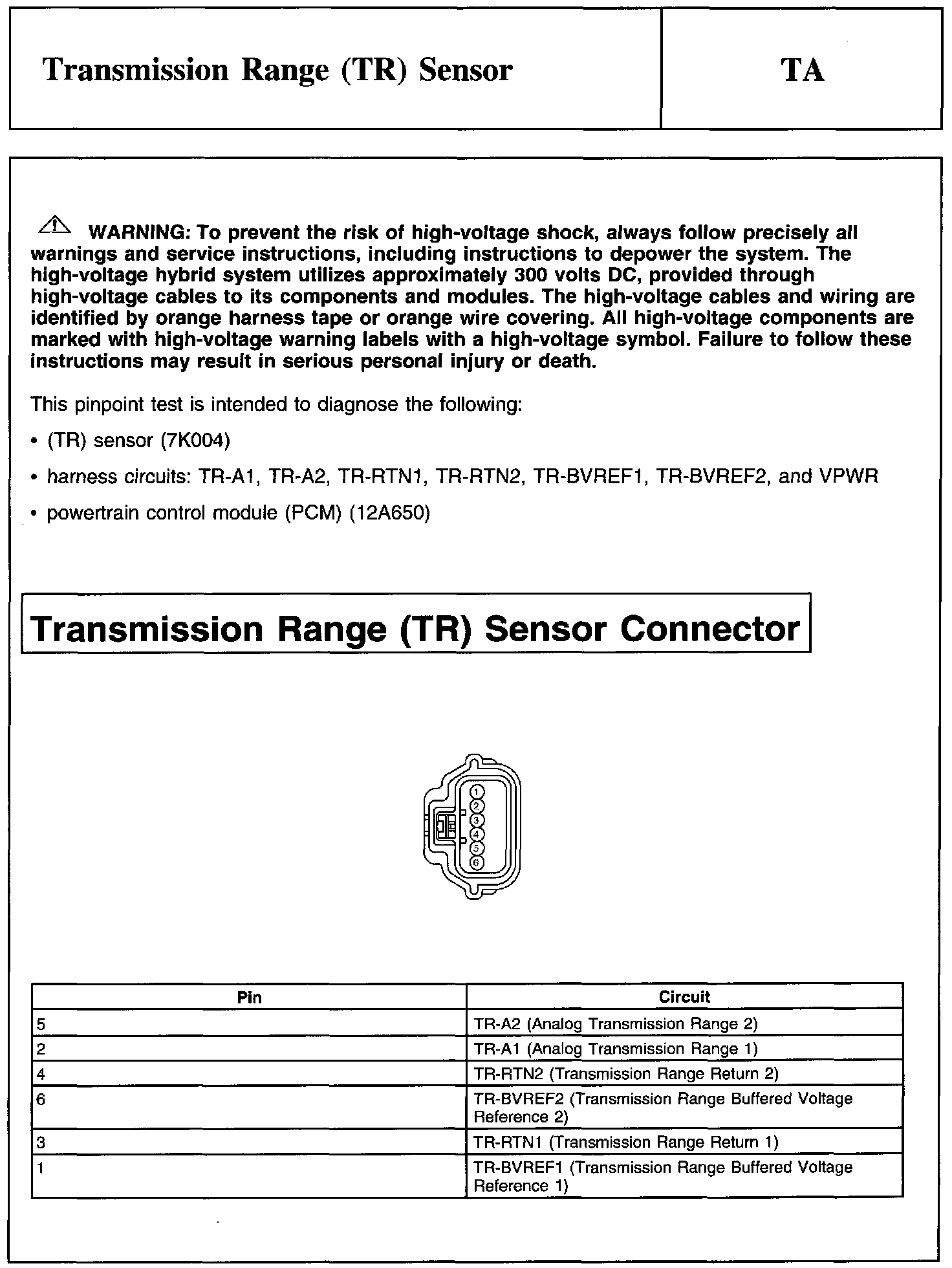 Test TA: Transmission Range (TR) Sensor