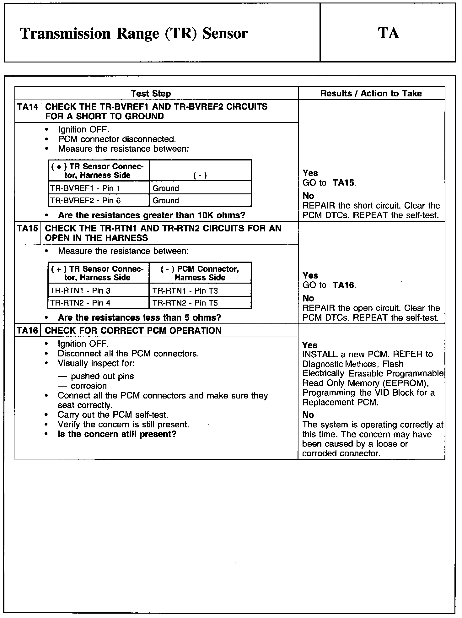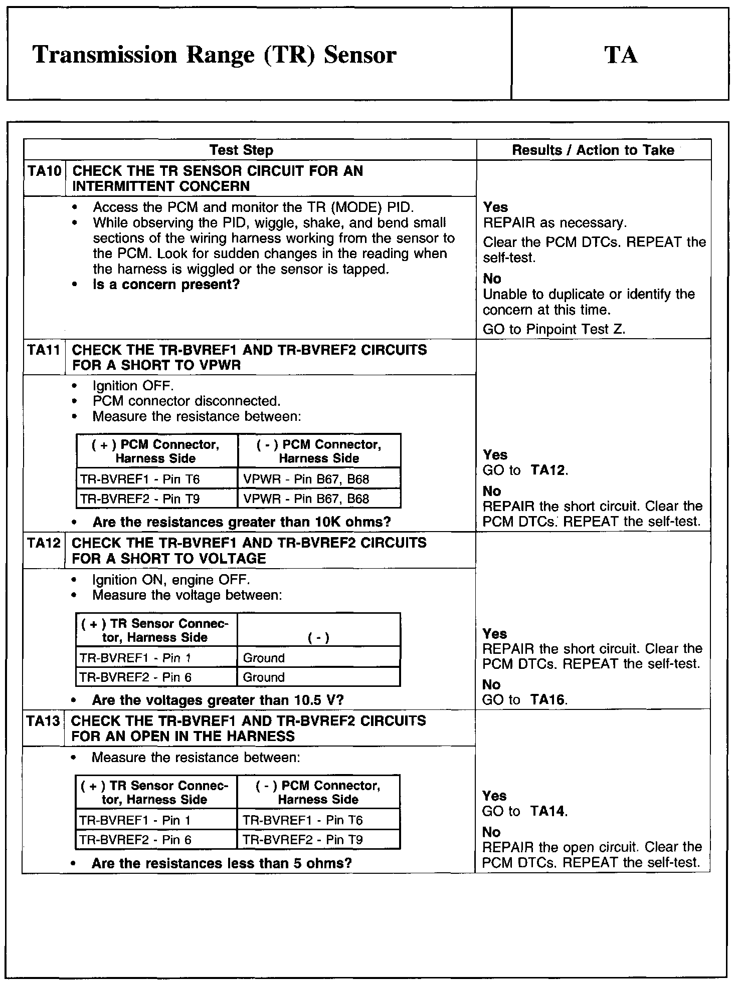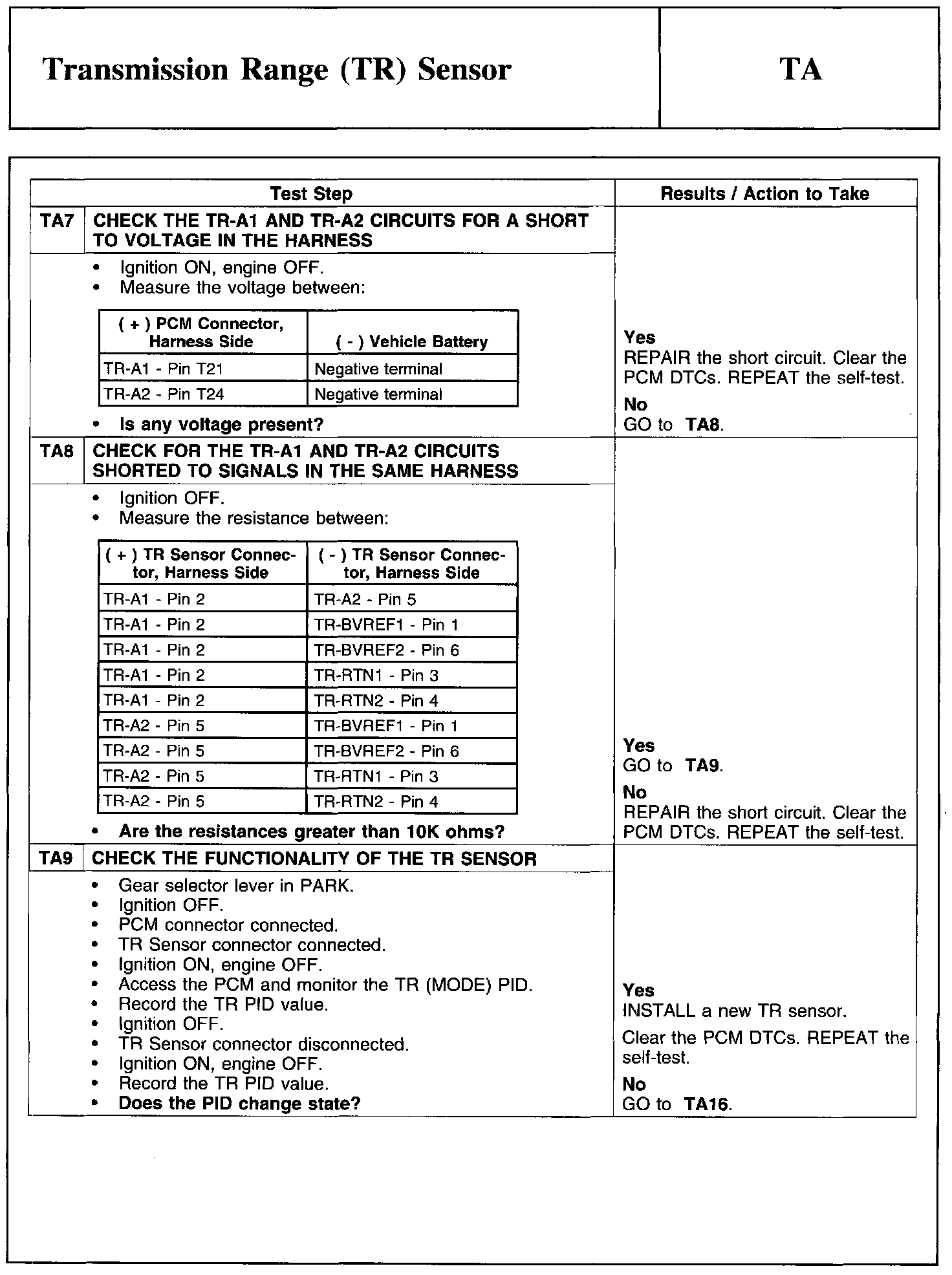 Test TA: Transmission Range (TR) Sensor