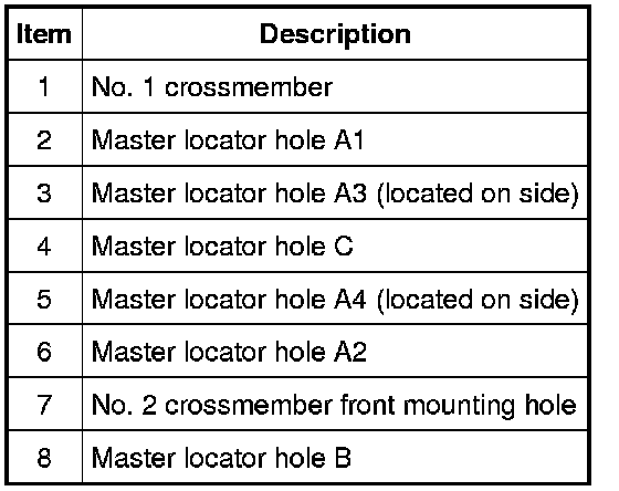 8. Measure in a straight line the diagonal distance from the center of master locator hole A1 (2), to the No. 2 crossmember front mounting hole (7), and record. Repeat for master locator hole A2 (6), to the No. 2 crossmember front mounting hole on the opposite side. The difference in these distances must not exceed 6 mm (0.23 in). If the difference is greater than 6 mm (0.23 in), the entire frame must be replaced.