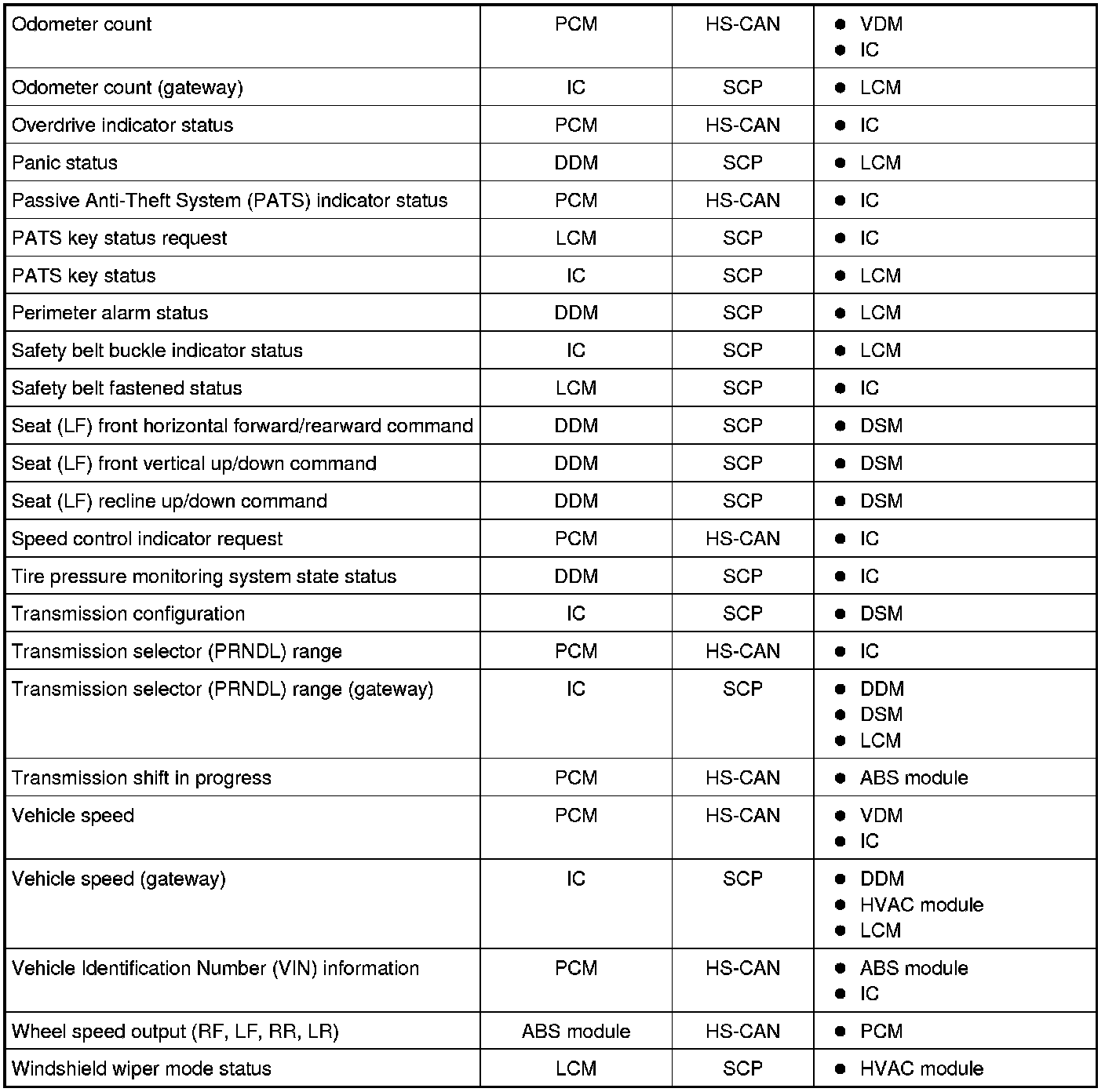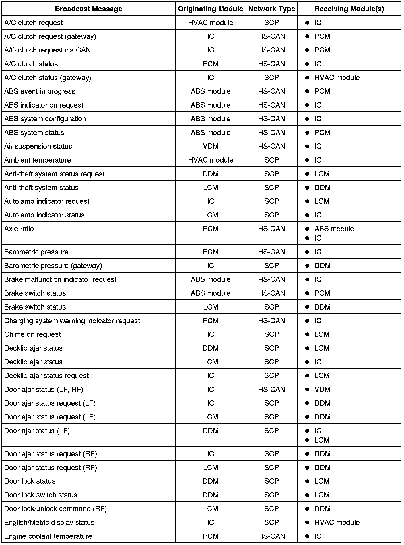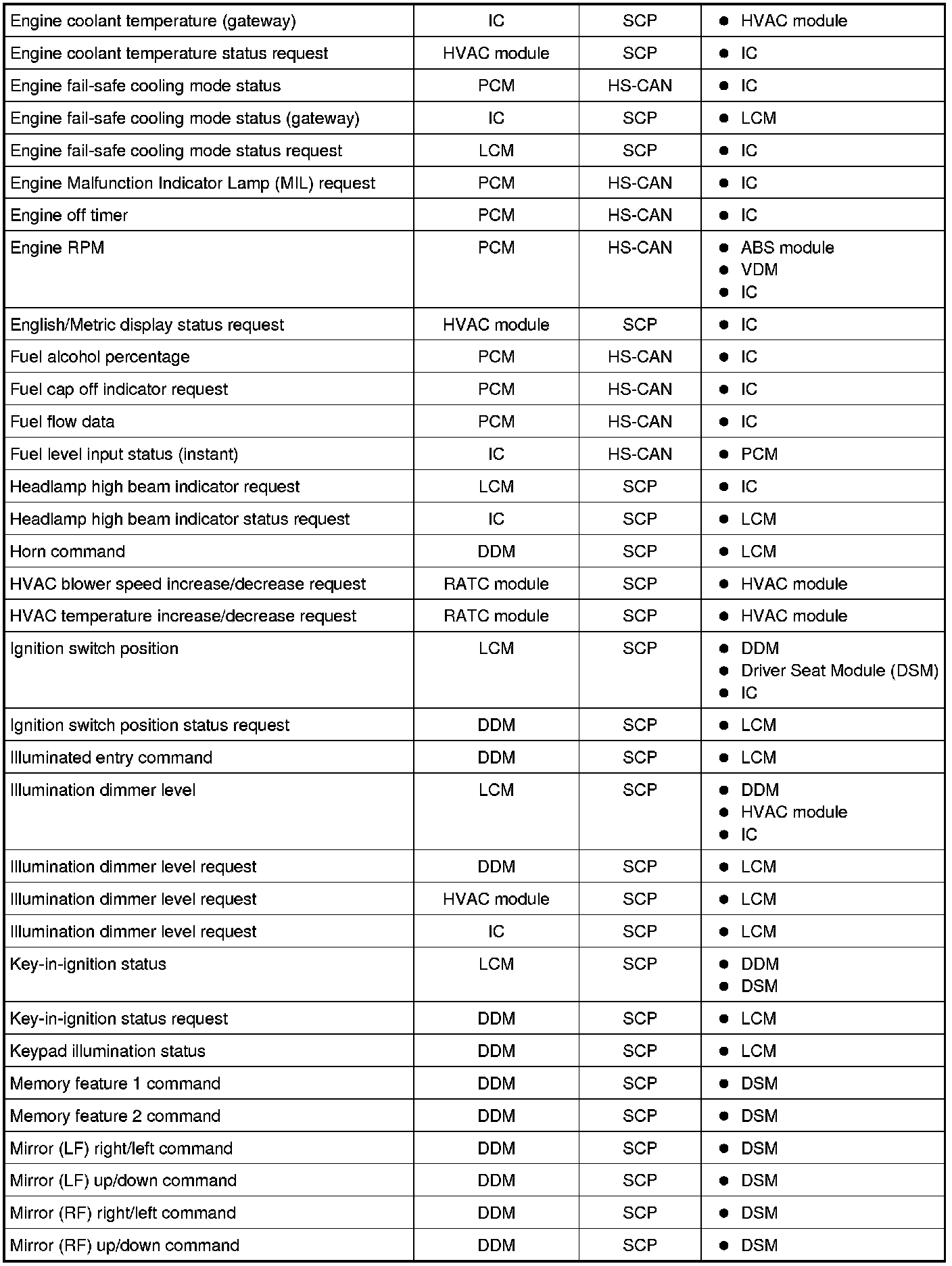 Modules in the CAN utilize simultaneous communication of 2 or more message on the same network circuits. The following chart summarizes the messages sent and received on the network.
