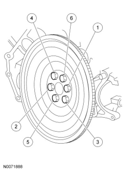 Position the flexplate and loosely install the 6 bolts. Tighten the bolts in the sequence shown.