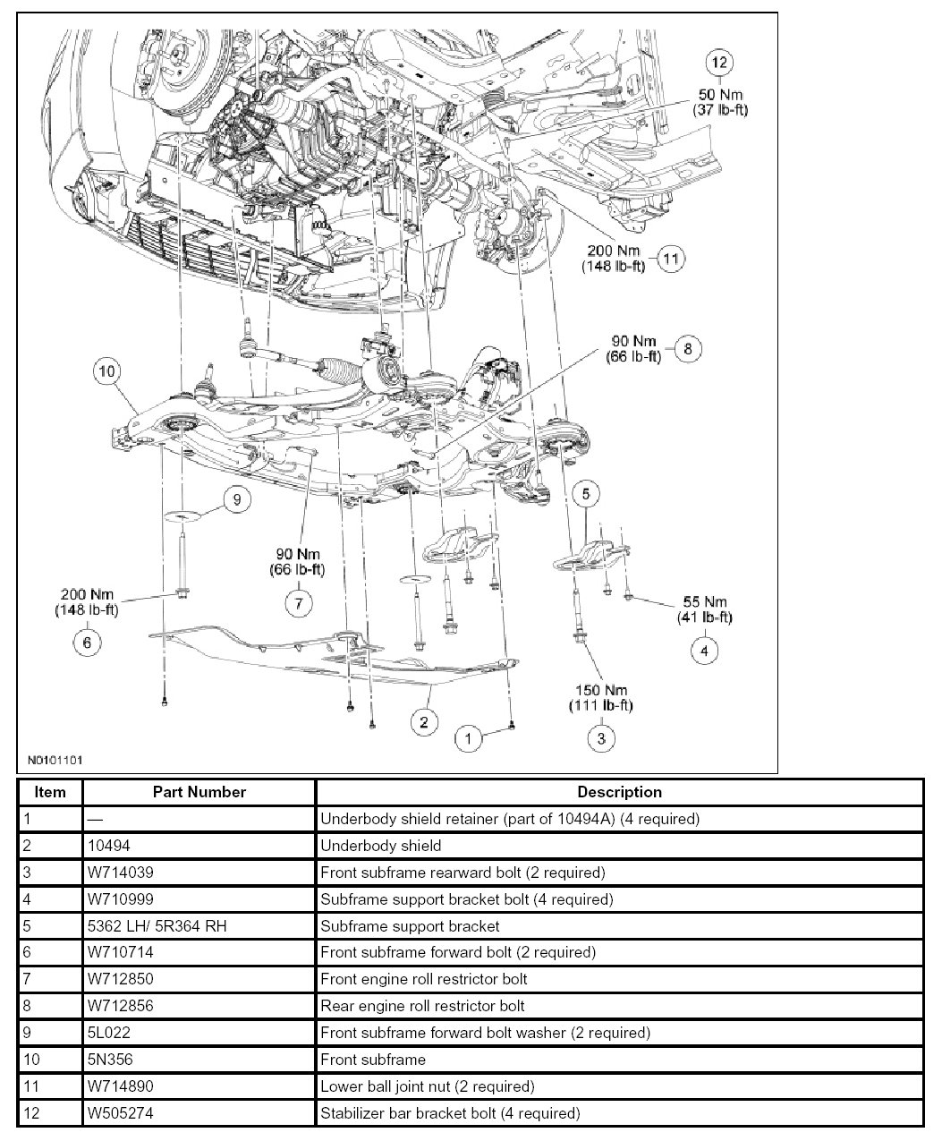 Tighten the 4 new subframe bracket-to-body bolts to 55 Nm (41 lb-ft).