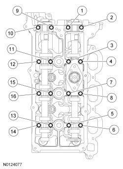 Install the 8 camshaft caps and the 16 bolts. Tighten the bolts in the sequence shown in the following stages:
