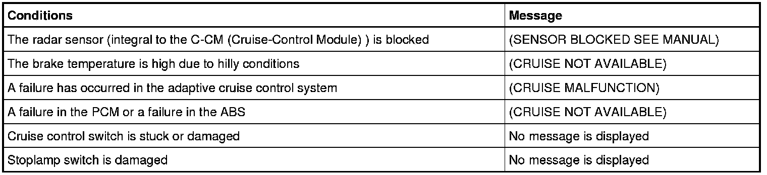 There are several conditions that might exist to cause the adaptive cruise control system to deactivate or prevent the system from activation. Some of the conditions have a message that is displayed in the message center. These conditions include: