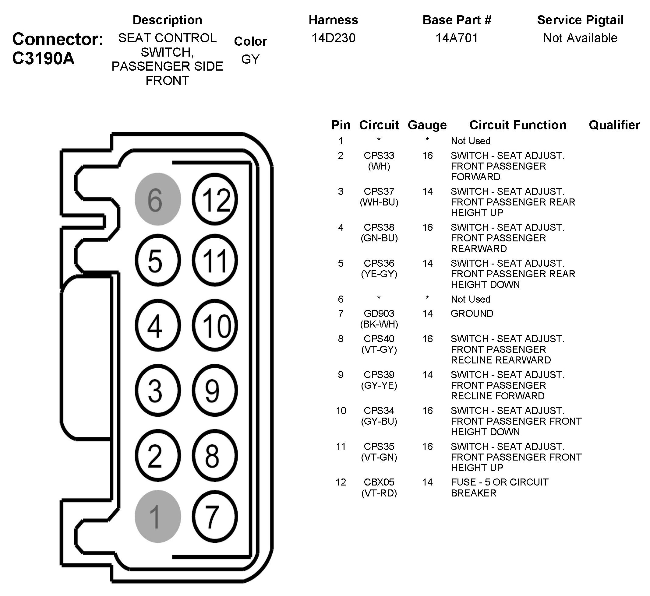 C3190A Seat Control Switch, Passenger Side Front