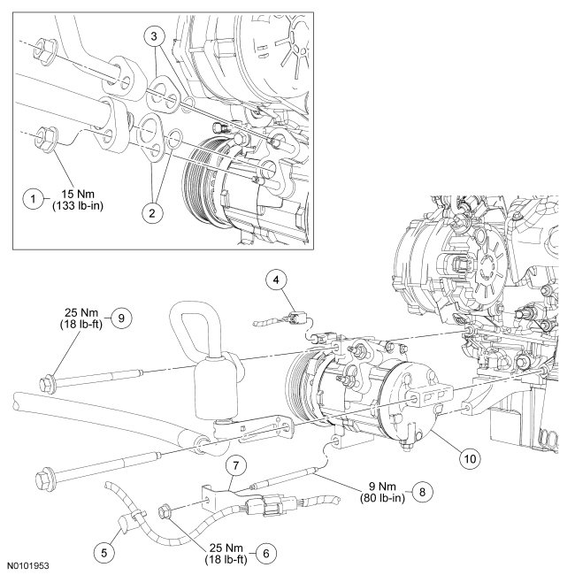 NOTE: A new A/C compressor may come equipped with an A/C clutch disc and hub, A/C compressor pulley and A/C clutch field coil already installed. If these components are not pre-installed, it will be necessary to transfer these parts from the old A/C compressor to the new compressor prior to installation of the A/C compressor if suitable for reuse.