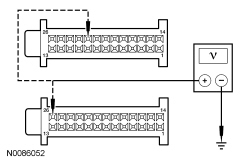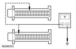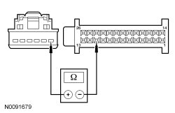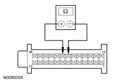 Measure the resistance between HVAC module C228B/C2356B-25, circuit CH213 (BN/GN), harness side and HVAC module C228B/C2356B-26, circuit CH212 (BU/OG), harness side.
