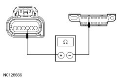 - Measure the resistance between the SOD-R (Side Obstacle Detection Control Module - Right) C4370-3, circuit VDB06 (GY/OG), harness side and the Data Link Connector (DLC) C251-3, circuit VDB06 (GY/OG), harness side.